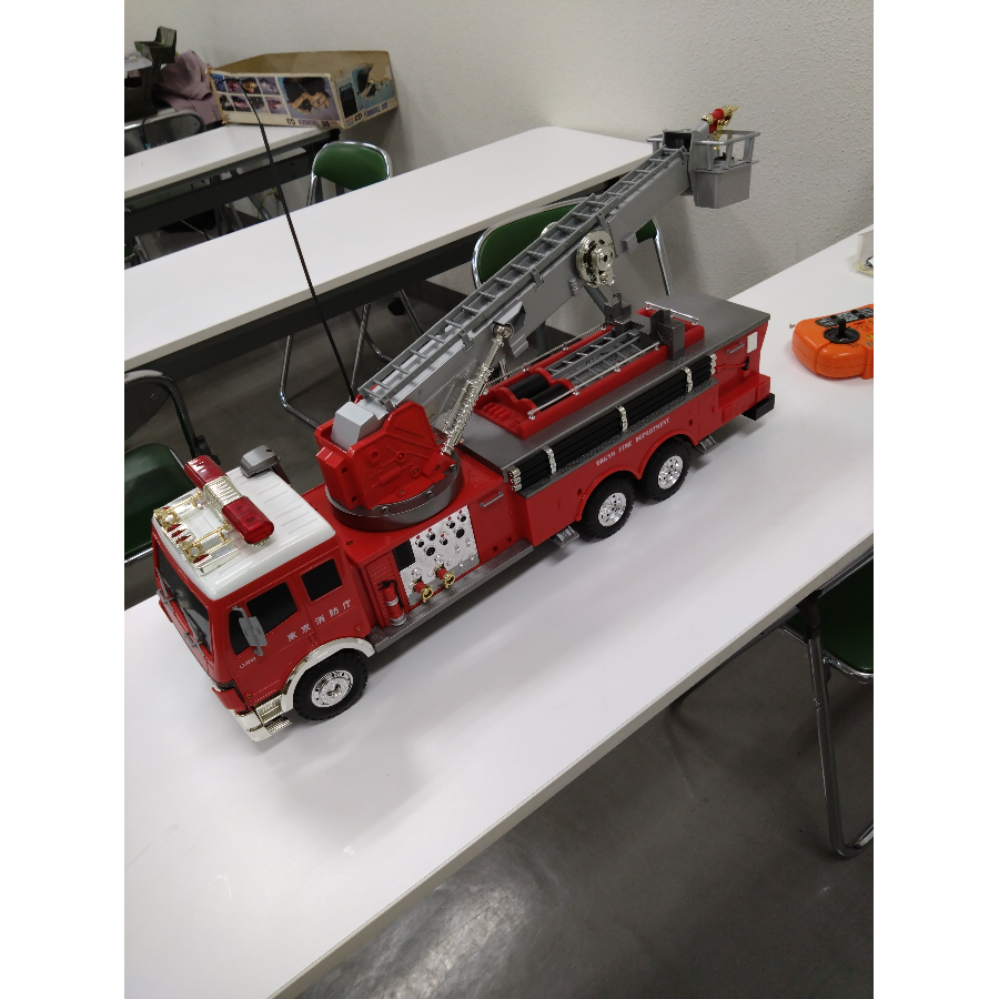 この消防車は施設の職員の方の個人的な持ち物でしたが、施設のみんなにぜひ動くところを見せたいと私たちに相談してくれたものです。長く使用していなかったこともありバッテリー充電の接続口のサビ、はしごスライドの不安定、走行時のカーブ動作の不良などが有りました。すべての状態を直すのに繰り返し預けていただき、また操縦の確認など繰り返し無事修理することができました。そんな思い出のある消防車でした。