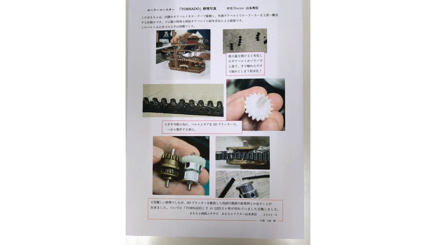 〇修理はボランティアとして無料ですが交換部品などで費用の掛かる場合もあります。これまでの例としては、オルゴールのセット部品、イルミネーションの光光源のランプなどが有りました、ピニオンギヤなどの歯車はムササビの備品の在庫で賄うことが多いです。